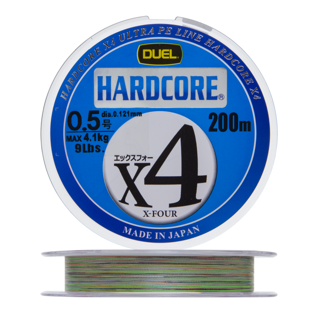 Hardcore X4 PE — четырехжильный плетеный шнур известного японского бренда Duel, ставший популярным у спиннингистов благодаря своей планке качества и относительно низкой цене. Технология плетения, обеспечивающая максимальную плотность шнура, позволяет достичь высокой прочности даже на малых диаметрах — самый тонкий Hardcore X4 PE сечением 0,104 мм имеет разрывную нагрузку в 3,6 кг (8 lb). Очень гладкая поверхность шнура, которая делает его тактильно похожим на леску, способствует увеличению дальности заброса за счет уменьшения силы трения о бортик катушки и кольца спиннинга. Это должны оценить любители береговой ловли, причем приверженцев джига данный шнур приятно удивит еще и хорошей устойчивостью к абразиву.