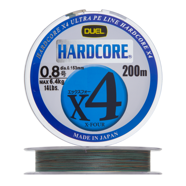 Hardcore X4 PE — четырехжильный плетеный шнур известного японского бренда Duel, ставший популярным у спиннингистов благодаря своей планке качества и относительно низкой цене. Технология плетения, обеспечивающая максимальную плотность шнура, позволяет достичь высокой прочности даже на малых диаметрах — самый тонкий Hardcore X4 PE сечением 0,104 мм имеет разрывную нагрузку в 3,6 кг (8 lb). Очень гладкая поверхность шнура, которая делает его тактильно похожим на леску, способствует увеличению дальности заброса за счет уменьшения силы трения о бортик катушки и кольца спиннинга. Это должны оценить любители береговой ловли, причем приверженцев джига данный шнур приятно удивит еще и хорошей устойчивостью к абразиву.