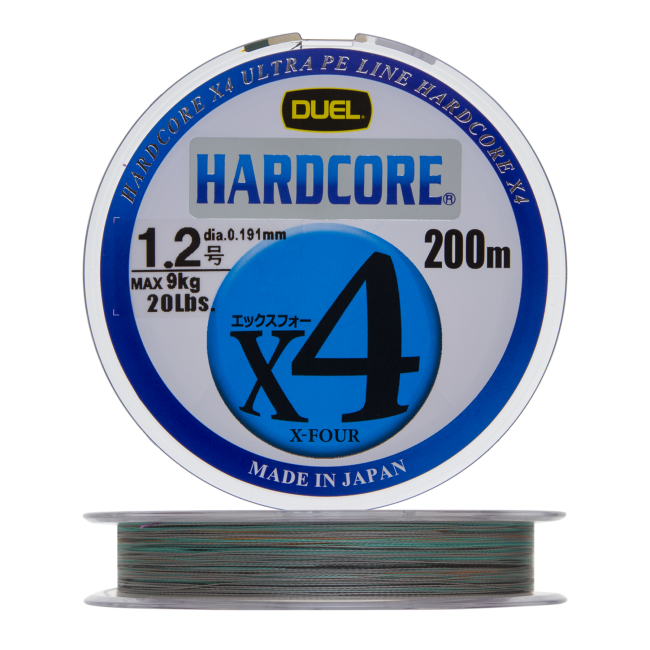 Hardcore X4 PE — четырехжильный плетеный шнур известного японского бренда Duel, ставший популярным у спиннингистов благодаря своей планке качества и относительно низкой цене. Технология плетения, обеспечивающая максимальную плотность шнура, позволяет достичь высокой прочности даже на малых диаметрах — самый тонкий Hardcore X4 PE сечением 0,104 мм имеет разрывную нагрузку в 3,6 кг (8 lb). Очень гладкая поверхность шнура, которая делает его тактильно похожим на леску, способствует увеличению дальности заброса за счет уменьшения силы трения о бортик катушки и кольца спиннинга. Это должны оценить любители береговой ловли, причем приверженцев джига данный шнур приятно удивит еще и хорошей устойчивостью к абразиву.
