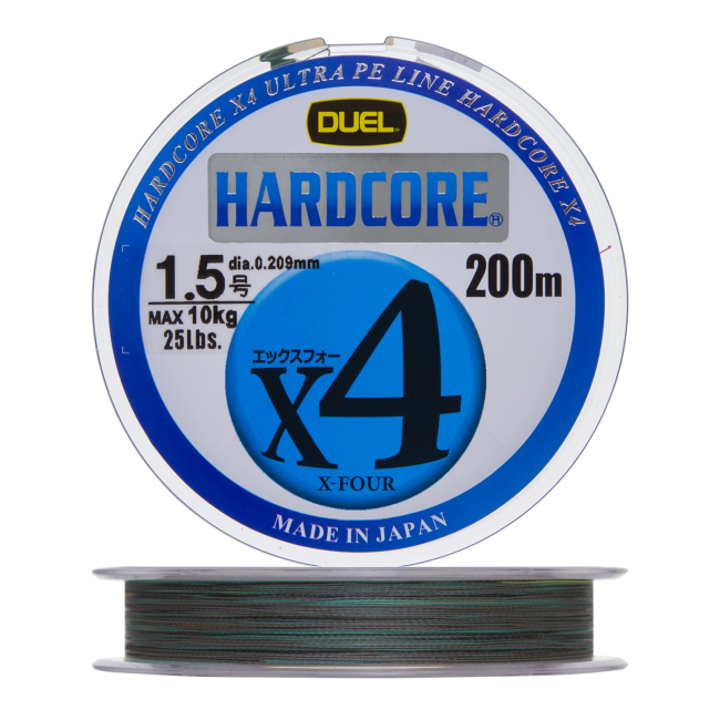 Hardcore X4 PE — четырехжильный плетеный шнур известного японского бренда Duel, ставший популярным у спиннингистов благодаря своей планке качества и относительно низкой цене. Технология плетения, обеспечивающая максимальную плотность шнура, позволяет достичь высокой прочности даже на малых диаметрах — самый тонкий Hardcore X4 PE сечением 0,104 мм имеет разрывную нагрузку в 3,6 кг (8 lb). Очень гладкая поверхность шнура, которая делает его тактильно похожим на леску, способствует увеличению дальности заброса за счет уменьшения силы трения о бортик катушки и кольца спиннинга. Это должны оценить любители береговой ловли, причем приверженцев джига данный шнур приятно удивит еще и хорошей устойчивостью к абразиву.