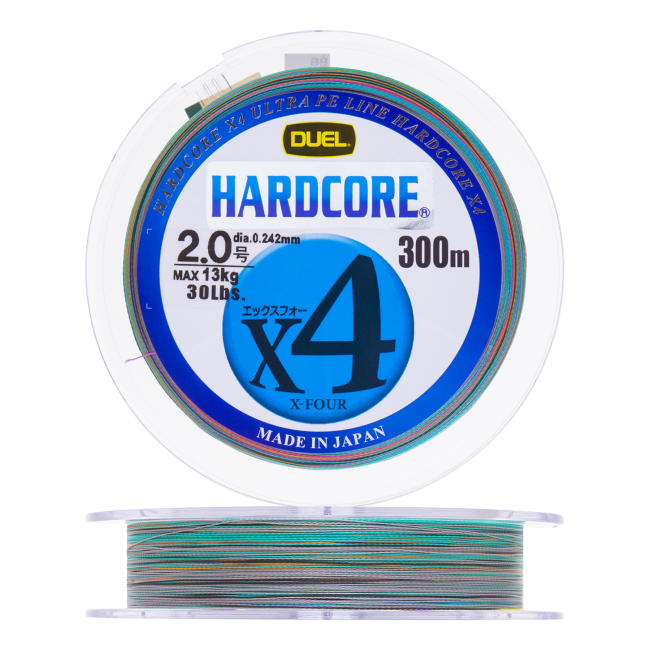 Hardcore X4 PE — четырехжильный плетеный шнур известного японского бренда Duel, ставший популярным у спиннингистов благодаря своей планке качества и относительно низкой цене. Технология плетения, обеспечивающая максимальную плотность шнура, позволяет достичь высокой прочности даже на малых диаметрах — самый тонкий Hardcore X4 PE сечением 0,104 мм имеет разрывную нагрузку в 3,6 кг (8 lb). Очень гладкая поверхность шнура, которая делает его тактильно похожим на леску, способствует увеличению дальности заброса за счет уменьшения силы трения о бортик катушки и кольца спиннинга. Это должны оценить любители береговой ловли, причем приверженцев джига данный шнур приятно удивит еще и хорошей устойчивостью к абразиву. Линейка Hardcore X4 PE представлена в более чем десяти различных диаметрах, каждый из которых включает в себя три варианта размотки: 150, 200 и 300 м. Шнур можно использовать как в пресноводной, так и в морской рыбалке. Цветовая гамма Hardcore X4 PE насчитывает в себе четыре цвета: Green, Orange, MilkyGreen и MultiColor. Более яркие цвета удобно использовать в темное время суток, а также там, где пейзажи достаточно тусклые, так получится максимальный контраст между шнуром и окружающей рыболова средой. MultiColor примечателен тем, что цвета меняются через каждые десять метров, за счет чего можно контролировать примерную дальность заброса.