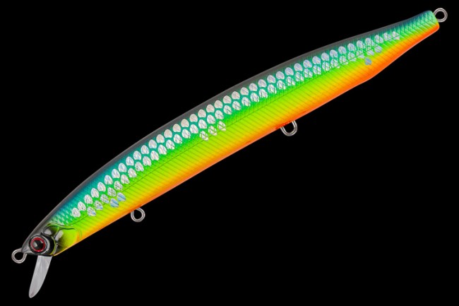 Воблер GERA 130SP мы также относим к отряду воблеров "big minnow". Эта модель была изначально разработана и сконструирована, как воблер-поисковик, для ловли серьезных, трофейных рыб на сверхдальних дистанциях, Не секрет, что каждый метр водный глади, отвоеванный спиннингистом у водоема, существенно повышает шансы на поимку осторожного трофея. Дальним забросам способствует аэродинамическая форма тела, небольшая лопата и магнитная система заброса, внутренняя балансировка воблера. GERA 130SP от TsuYoki обладает собственной игрой,но для активного поиска хищника метод-твичинг,все же предпочтительней. На агрессивном, твичинге с отдачей шнура GERA 130SP показывает пресловутую "елочку" с ленивым "роллингом", уходя в сторону на 2-3 корпуса и заглубляясь при этом на 1.0-1.2 метра в зависимости от толщины шнура. Причем, характер игры не меняется от длинны дистанции, надо только помнить, что на дальнем расстоянии воблером надо работать более размашистыми движениями удилища. Область применения данной приманки весьма широка, это и ловля с берега и ловля на большой водной акватории, везде, где нужен дальний и, что немало важно, точный заброс. Основные трофеи данной модели это не только щука и окунь, а также и жерех, причем не только " котловой", но и матерый,осторожный одиночка. Воблер оснащен крючками VMC, силовыми кольцами, изготовлен из прочного пластика. Имеет прочное ЛКП.