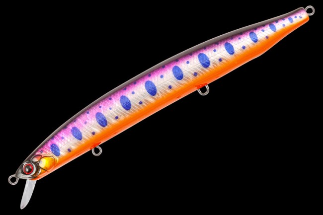 Воблер GERA 130SP мы также относим к отряду воблеров "big minnow". Эта модель была изначально разработана и сконструирована, как воблер-поисковик, для ловли серьезных, трофейных рыб на сверхдальних дистанциях, Не секрет, что каждый метр водный глади, отвоеванный спиннингистом у водоема, существенно повышает шансы на поимку осторожного трофея. Дальним забросам способствует аэродинамическая форма тела, небольшая лопата и магнитная система заброса, внутренняя балансировка воблера. GERA 130SP от TsuYoki обладает собственной игрой,но для активного поиска хищника метод-твичинг,все же предпочтительней. На агрессивном, твичинге с отдачей шнура GERA 130SP показывает пресловутую "елочку" с ленивым "роллингом", уходя в сторону на 2-3 корпуса и заглубляясь при этом на 1.0-1.2 метра в зависимости от толщины шнура. Причем, характер игры не меняется от длинны дистанции, надо только помнить, что на дальнем расстоянии воблером надо работать более размашистыми движениями удилища. Область применения данной приманки весьма широка, это и ловля с берега и ловля на большой водной акватории, везде, где нужен дальний и, что немало важно, точный заброс. Основные трофеи данной модели это не только щука и окунь, а также и жерех, причем не только " котловой", но и матерый,осторожный одиночка. Воблер оснащен крючками VMC, силовыми кольцами, изготовлен из прочного пластика. Имеет прочное ЛКП.
