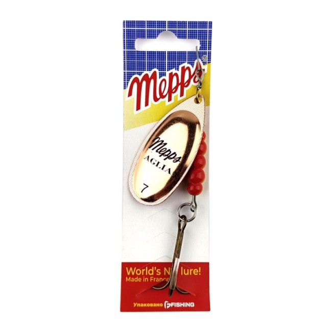 AGLIA — одна из самых популярных классических моделей MEPPS. При вращении угол отклонения лепестка от оси составляет 60°. Все размеры блесен обладают большим лобовым сопротивлением, именуемым на языке рыболовов — «упористостью». Это очень полезное свойство, обеспечивающее активное воздействие на боковую линию рыбы. Кроме того, AGLIA устойчиво «работает» даже при самой минимальной скорости движения, что позволяет осуществлять ее длительную проводку в зоне предполагаемой стоянки рыбы. Возможность использования этой модели на различных глубинах делает эту приманку очень удобной для ловли большинства видов рыб. Например, если AGLIA №1, 2, 3 хороши при ловле форели, окуня, голавля, жереха, язя, то более солидные №4, 5 — часто незаменимы при охоте за тайменем и крупной щукой. AGLIA в основном предназначена для водоемов со слабым течением и стоячей водой. При ее использовании на быстрине, проводку следует осуществлять только вниз по течению. С появлением скоростных безынерционных катушек популярность этой приманки незаслуженно снизилась, так как рыболовы новички стали отдавать предпочтение более «спокойным» COMET, не требующим очень медленной проводки. Несмотря на это, AGLIA во многих случаях, при правильном ее использовании, намного эффективнее других моделей вращающихся блесен. Базовый вариант этой блесны комплектуется лепестками серебряного, золотого, медного и черного цветов.